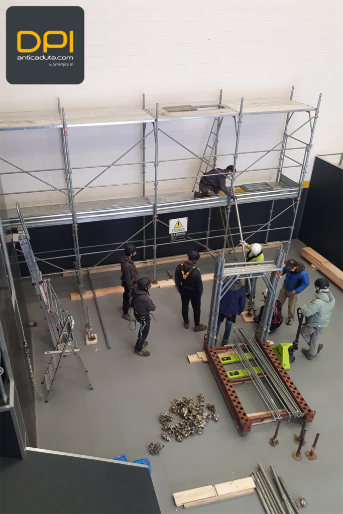 – Modulo pratico (14 ORE): Montaggio, smontaggio, trasformazione di ponteggio a tubi e giunti (PTG); montaggio, smontaggio, trasformazione di ponteggio a telai prefabbricati (PTP); montaggio, smontaggio, trasformazione di ponteggio a montanti e traversi prefabbricati (PMTP). Elementi di gestione prima emergenza – salvataggio. Prova pratica di verifica finale.